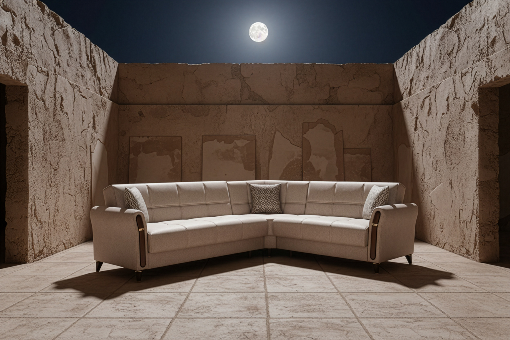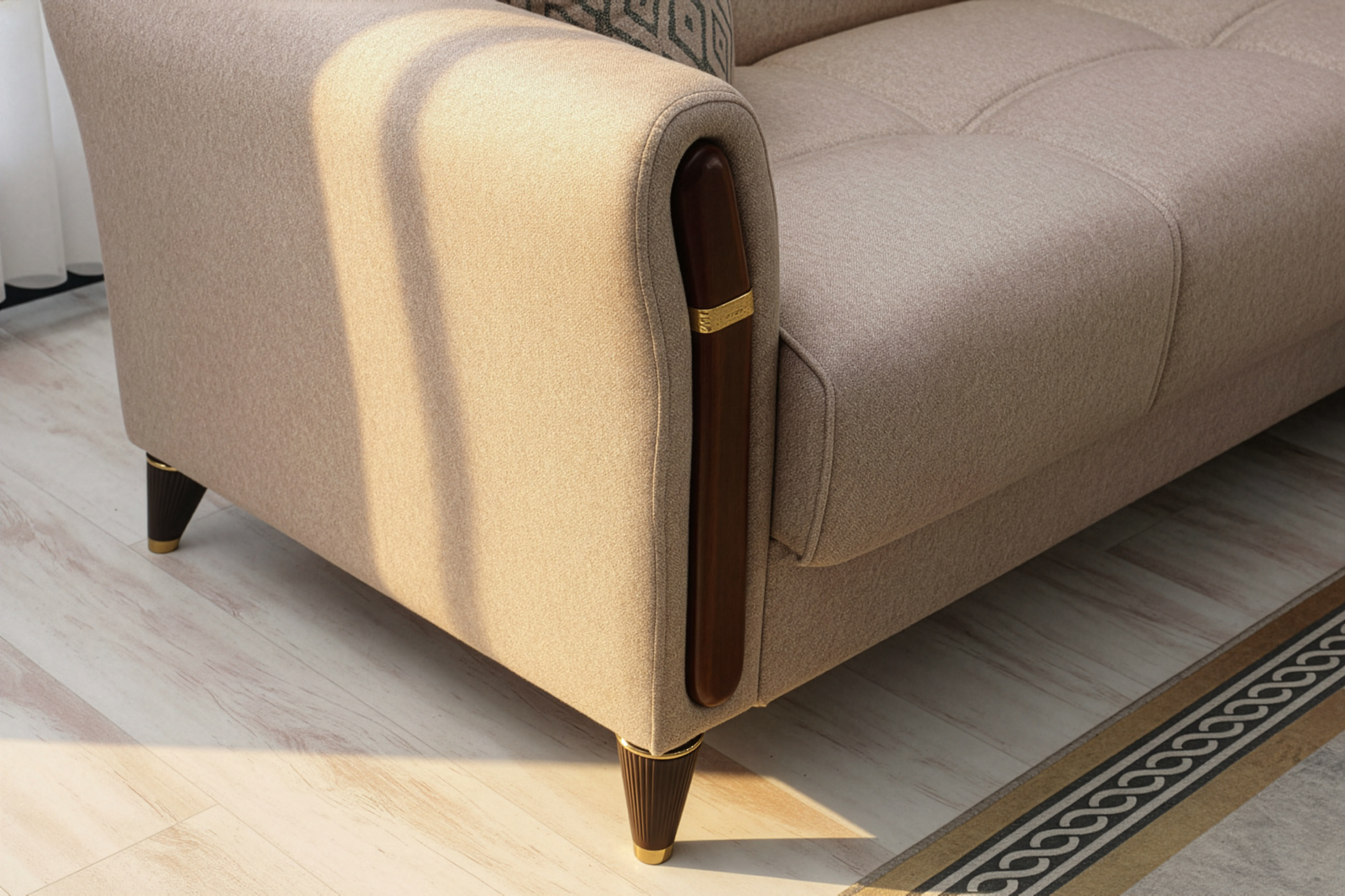 Wie ein persischer Teppich, der in einer Jurte ausgebreitet wird, vereint dieses Sofa Leichtigkeit und Bodenständigkeit. Seine einladenden Proportionen bilden einen Kreis der Geselligkeit, in dem die strukturierten Stoffe von fernen Reisen erzählen.